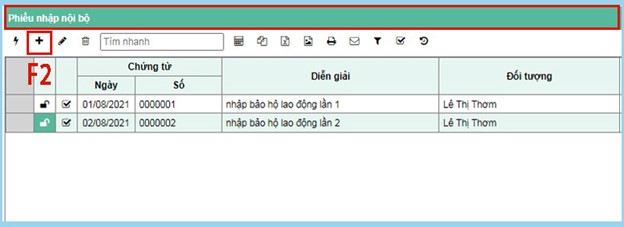 Tại màn hình Phiêu nhập nội bộ, nhấn dấu + trên thanh menu hoặc phím tắt F2 để nhập liệu nghiệp vụ mới.