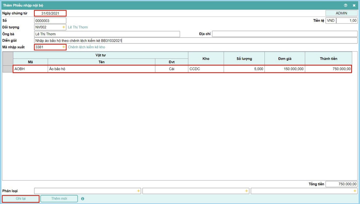 Ngày 31/03/2021 kiểm tra kho CCDC phát hiện số lượng tồn kho áo bảo hộ nhiều hơn 5 chiếc so với sổ sách kế toán ghi nhận. Trung binh 1 chiếc trị giá 150.000đ, chưa rõ nguyên nhân. Muốn điều chỉnh nhập liệu bổ sung 5 chiếc áo bảo hộ vào sổ sách kế toán.