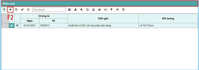 Tại màn hình nghiệp vụ Phiêu xuất, nhấn dấu + trên thanh menu hoặc phím tắt F2 để thêm mới nhập liệu.