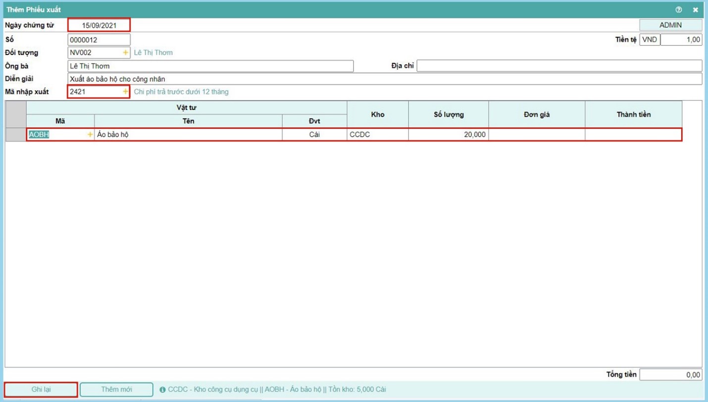 Ngày 15/09/2021, Xuất kho CCDC 20 áo bảo hộ cho công nhân.