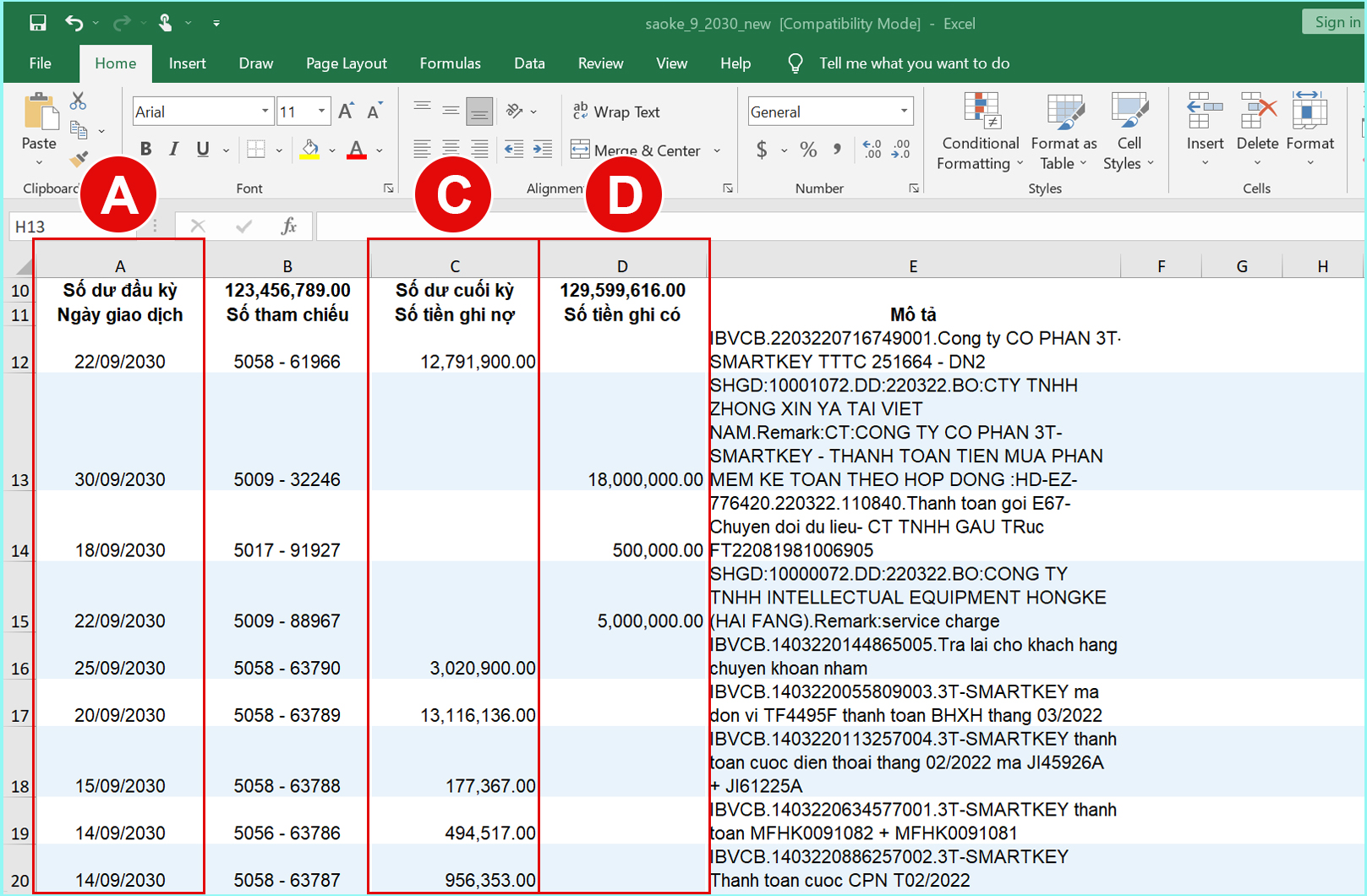 Nội dung dữ liệu ở từng cột excel có ý nghĩa gì thì chọn tương ứng để phần mềm so sánh đúng dữ liệu của cột đó. Phần mềm sẽ so sánh các giá trị gồm: Ngày chứng từ – Phát sinh Nợ – Phát sinh Có – Đối tượng. Ô Đối tượng nếu chọn thì sẽ so sánh đúng đối tượng chứng từ; nếu không muốn so sánh đối tượng thì để là “Không” Ví dụ: Thông tin ngày tháng ở cột A. Thông tin phát sinh tiền vào tài khoản ở cột D, …