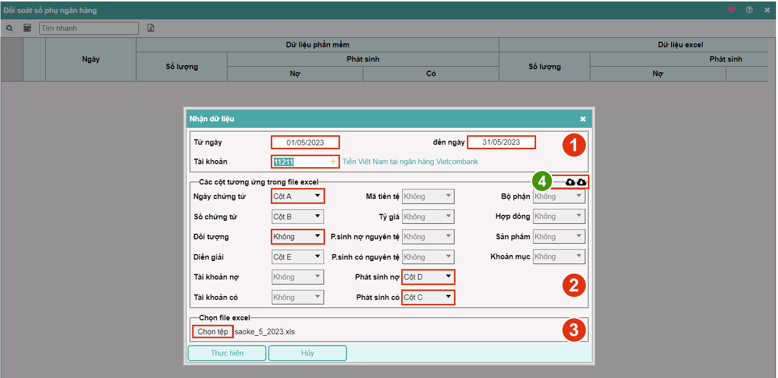 | 3 | Chọn file excel | Tích chọn file excel sao kê, sổ phụ ngân hàng chứa dữ liệu muốn đối soát. |