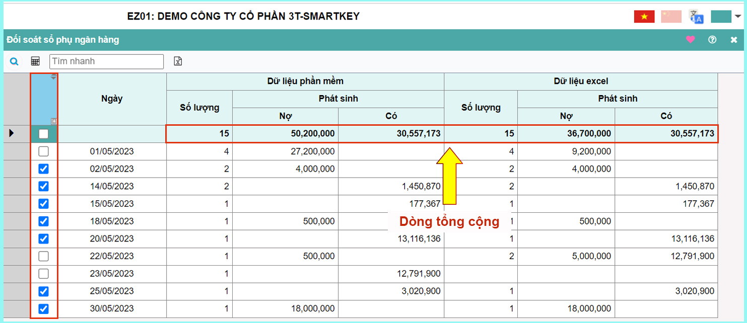- Nếu số liệu phát sinh theo từng ngày trùng khớp, phần mềm sẽ tích trùng