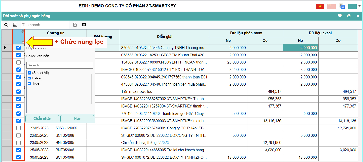Tại đây có thể sử dụng chức năng lọc tại cột đầu tiên (Bỏ chọn mục True) để lọc được danh sách các phát sinh chưa khớp nhau.