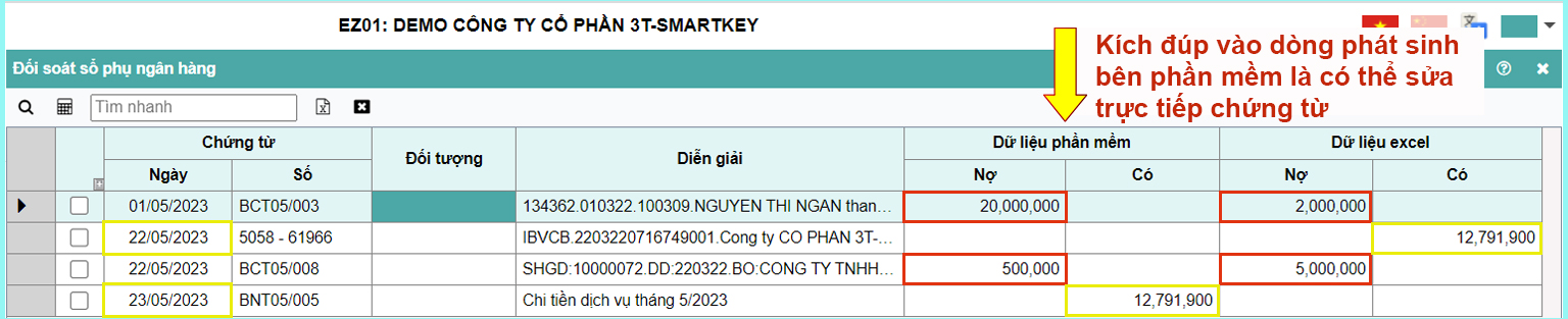 Dễ dàng nhìn thấy giá trị khác biệt, sau đó người dùng có thể KÍCH ĐÚP vào dòng phát sinh sai ở bên phần mềm để sửa lại chứng từ cho khớp với dữ liệu ngân hàng.