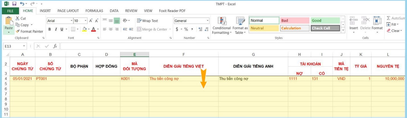 Điền dữ liệu về danh mục hoặc chứng từ tương ứng vào file excel mẫu đã tải về.