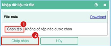 | Nhấn vào mục Chọn tệp sau đó chỉ đường dẫn trước đó lưu file excel mẫu đã hoàn thiện và chọn file.