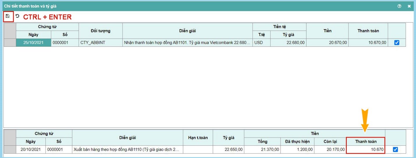Ví dụ tống ngoại tệ nhận được trong ảnh minh họa là 20.670 USD nhưng xác nhận chỉ thanh toán 10.670 USD cho hóa đơn 20/10/2021 còn 10.000 USD là đặt cọc cho hợp đồng mới thì tương ứng cột Thanh toán tự gõ: 10.670 USD.