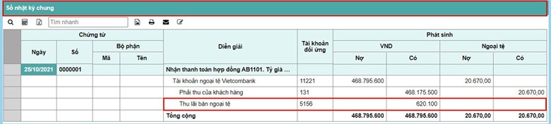 Sau khi hoàn thiện hạch toán và Tích chọn thanh toán theo hóa đơn kiểm tra lại các tài khoản hạch toán liên quan để chắc chắn chênh lệch tỷ giá được ghi nhận.