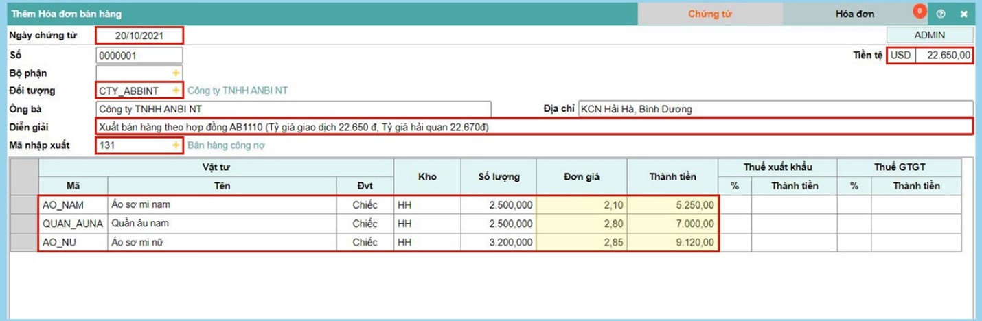 Ngày 20/10/2021, xuất bán lô hàng theo hợp đồng AB1101 cho Công ty TNHH ANBI NT. Thông tin chi tiết như sau: