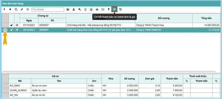 Nhấn biểu tượng chức năng “Chi tiết thanh toán và chênh lệch tỷ giá”.