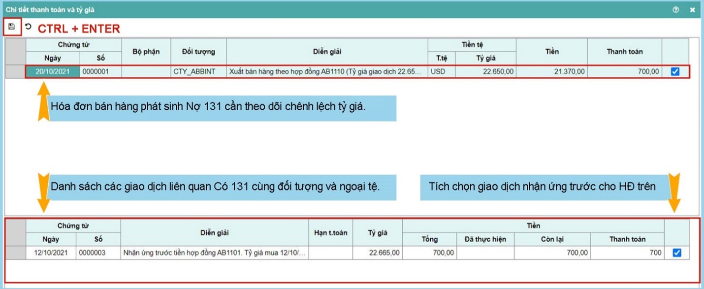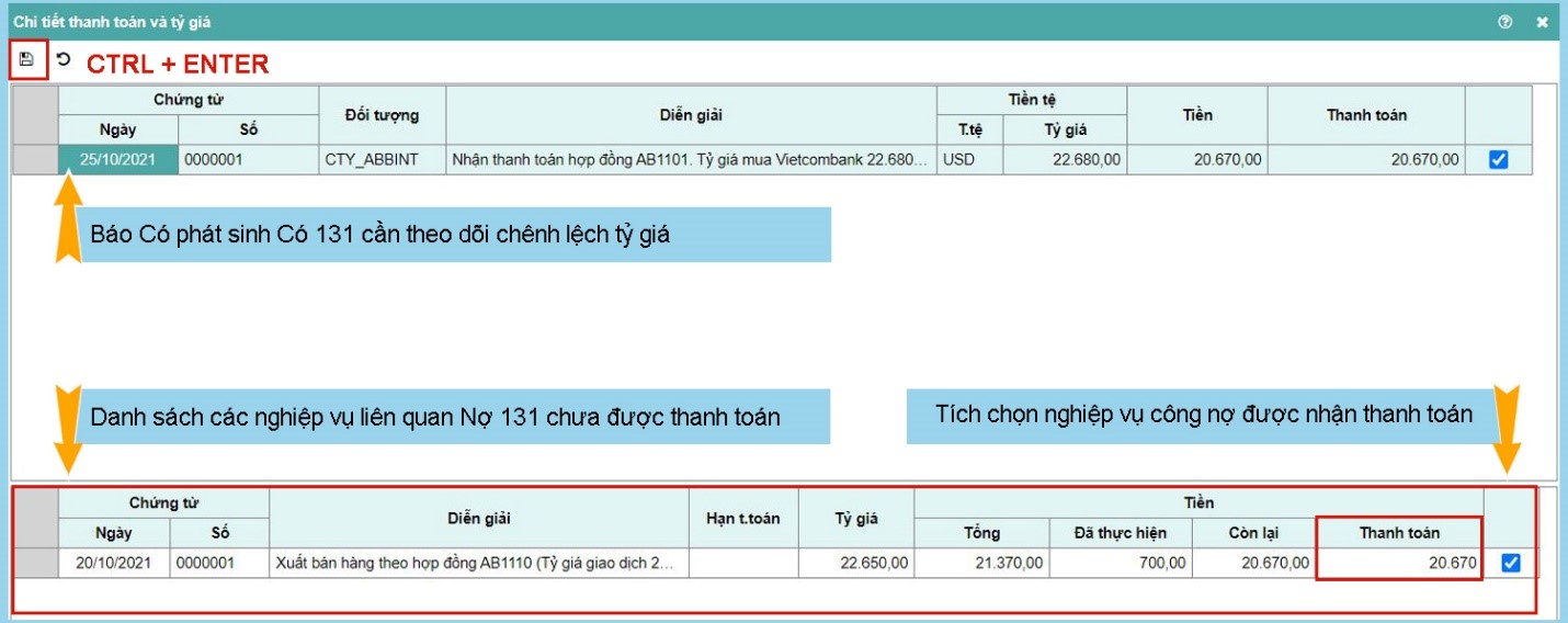Tiền tệ: Mã ngoại tệ giao dịch công nợ Nguyên tệ: Giá trị ngoại tệ giảm công nợ Tỷ giá: Nhảy theo tỷ giá của chứng từ Thành tiền: Giá trị quy đổi ra đồng tiền hạch toán (VNĐ) theo tỷ giá thực tế hôm phát sinh giao dịch. |