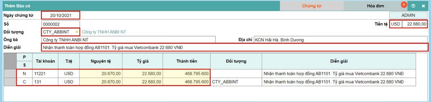 Tiền tệ: Mã ngoại tệ phát sinh giao dịch (USD) Nguyên tệ: Giá trị ngoại tệ nhận được Tỷ giá: Nhảy theo tỷ giá đã nhập phía trên. Thành tiền: = Nguyên tệ * Tỷ giá = Giá trị quy đổi ra đồng tiền hạch toán (VND) theo tỷ giá mua tại thời điểm phát sinh giao dịch. |