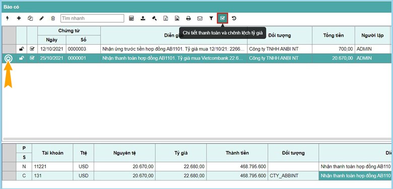 Tích chức năng “Chi tiết thanh toán và chênh lệch tỷ giá” trên thanh menu.