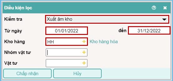 Dùng để rà soát các chứng từ vật tư xuất âm kho. Để chức năng kiểm tra này hoạt động cần chọn kỳ muốn kiểm tra và chọn mã kho cần kiểm tra.