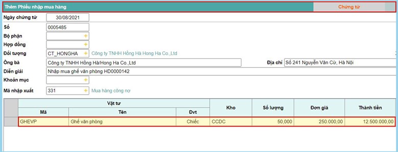 Ngày 30/08/2021 nhập mua lô ghế văn phòng tổng 50 chiếc – đơn giá: 250.000đ – Tổng tiền 12.500.000đ. Thuế 10%.