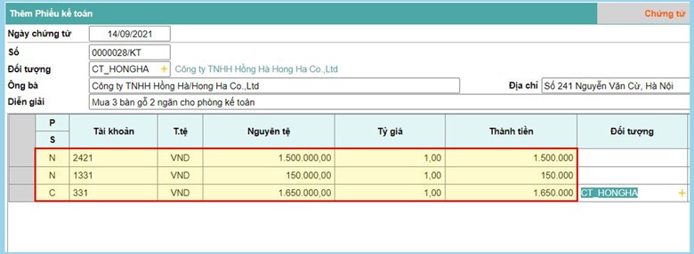 Bước 2: Hạch toán nghệp vụ ghi tăng tài sản