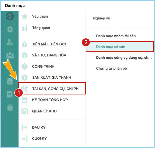 Vào phân hệ Tài sản, Công cụ, Chi phí chọn Danh mục tài sản.