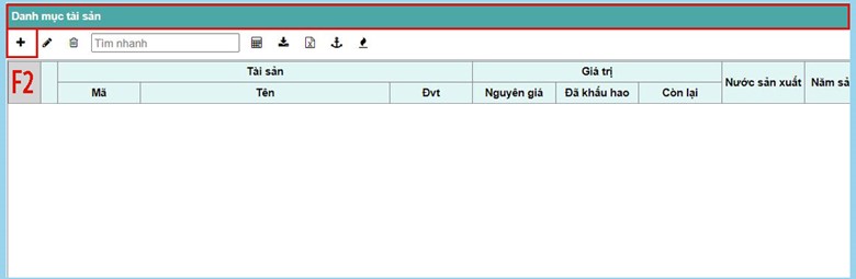 Hiện màn hình Danh mục tài sản nhần dấu + trên thanh menu hoặc phím tắt F2 để thêm mới khai báo thông tin tài sản muốn đăng ký khấu hao.