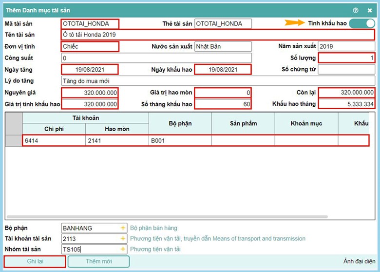 | 16 | Tài khoản chi phí | Giá trị khấu hao tháng muốn hạch toán ghi Nợ tài khoản chi phí gì thì để tương ứng tại tham số Tài khoản chi phí. |