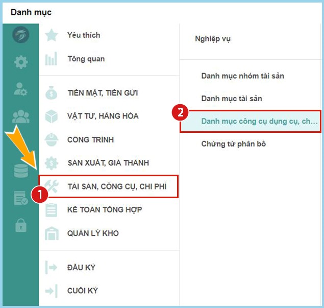 Thực hiện tương tự như đăng ký tài sản nhưng chọn phân hệ Danh mục công cụ dụng cụ – chi phí.