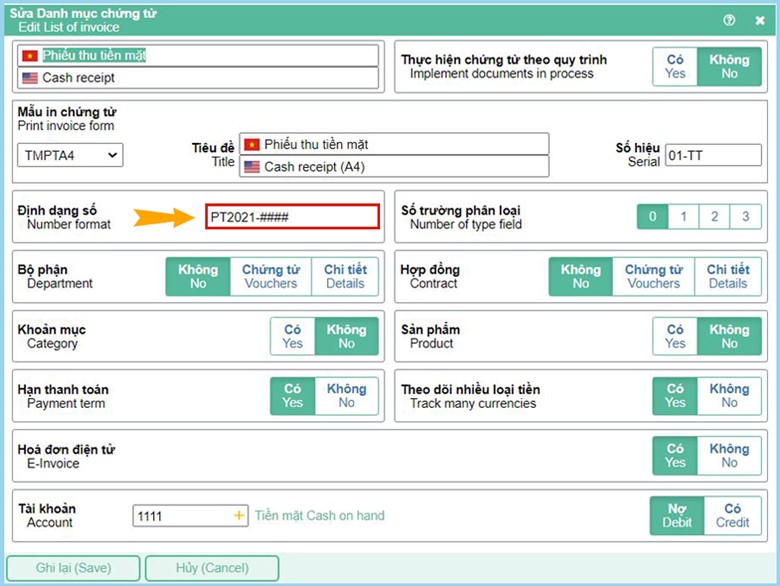 Tại màn hình “Sửa danh mục chứng từ” khai báo tại tham số “Định dạng số”. Phần số chứng từ sẽ chạy tự động và được đánh dấu định dạng tương ứng bằng phần dấu ###, phần text đi lèm là ký tự cố định. Ví dụ đặt: PT2021-### có nghĩa sau này số chứng từ sẽ nhảy là PC2021-001, PC2021-002,…