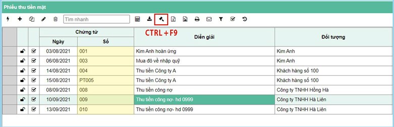 Trên thanh menu nhấn biểu tượng đánh lại số chứng từ – phím tắt là CTRL + F9.