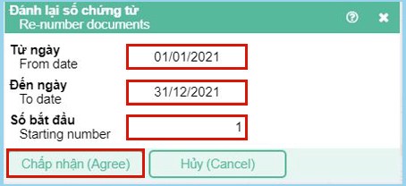 Hiện màn hình đánh lại số chứng từ. Tại đây sẽ điền thời gian muốn đánh lại số chứng từ liên tục và số bắt đầu. Nhấn Chấp nhận để phần mềm tiến hành thực hiện.