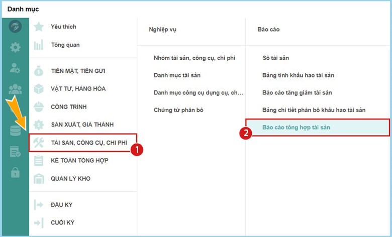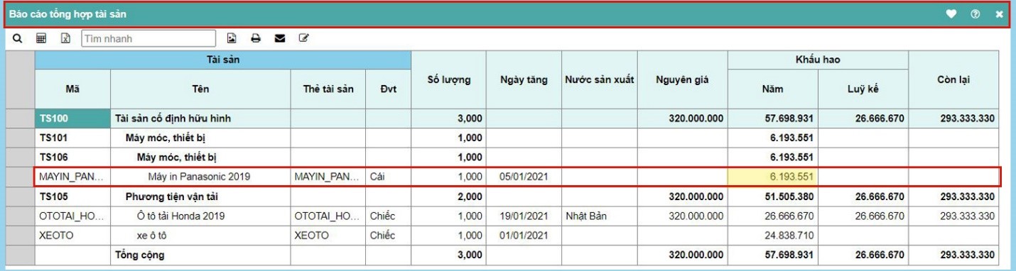 Sau khi tính khấu hao xong vào Báo cáo tổng hợp tài sản (Hoặc công cụ dụng cụ tương ứng) xem giá trị khấu hao lũy kế.