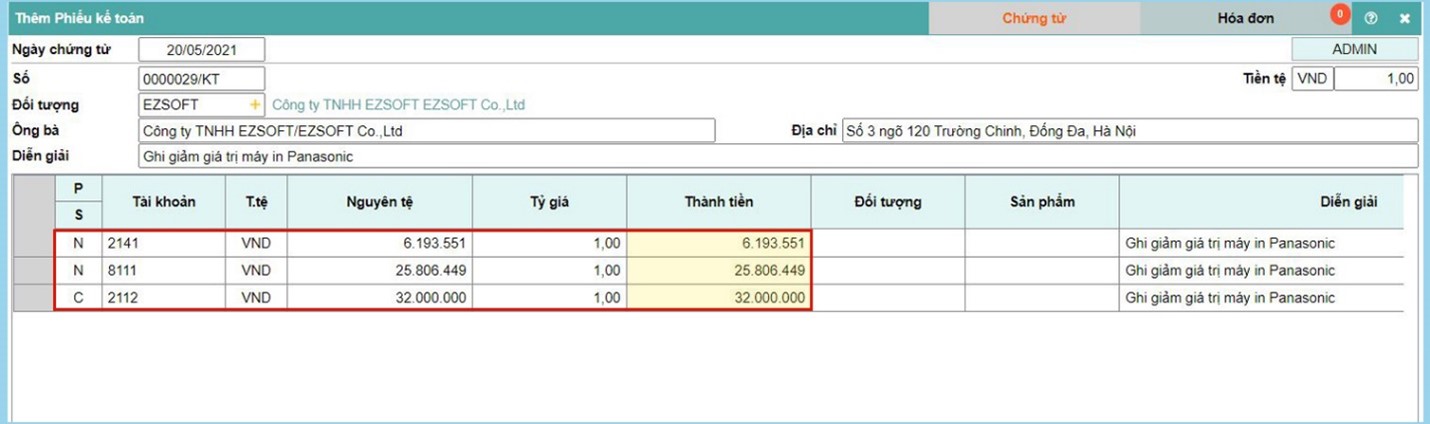 Máy in Panasonic trước đó được mua vào ngày 05/01/2021 với giá 32.000.000đ.