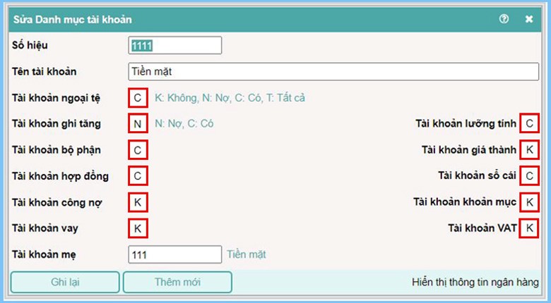• Mỗi tài khoản có thể khai báo theo dõi hoặc không theo dõi các tham số ngoại tệ, bộ phận, hợp đồng,.. liên quan phù hợp với mục đích hạch toán.