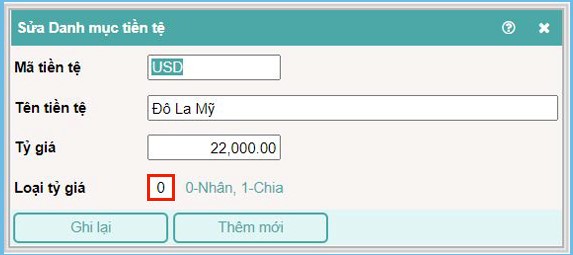 • Loại tỷ giá là 0-Nhân: Nếu đồng tiền ngoại tệ có giá trị lớn hơn đồng tiền phát sinh thì chọn loại tỷ giá là tỷ giá nhân. Ô Tỷ giá để giá trị quy đổi giữa 1 đồng ngoại tệ so với 1 đồng tiền hạch toán (VNĐ)