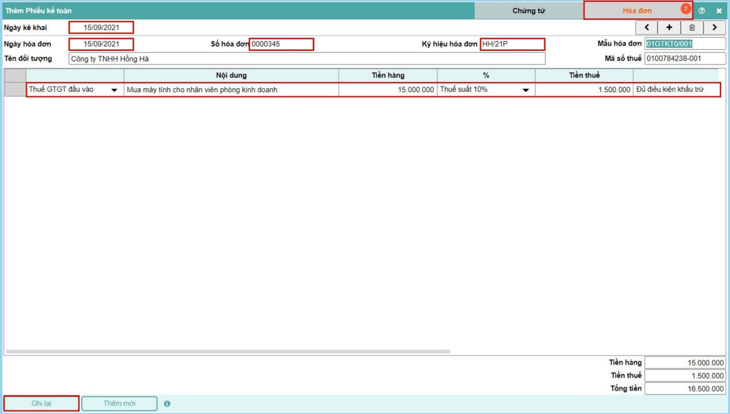 Nhấn Ghi lại hoặc phím tắt CTRL + ENTER để lưu lại cả nghiệp vụ hạch toán và kê khai hóa đơn.