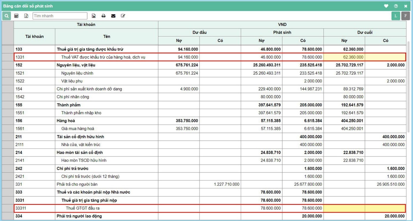 Kiểm tra số dư tài khoản thuế GTGT trên Bảng cân đối số phát sinh.