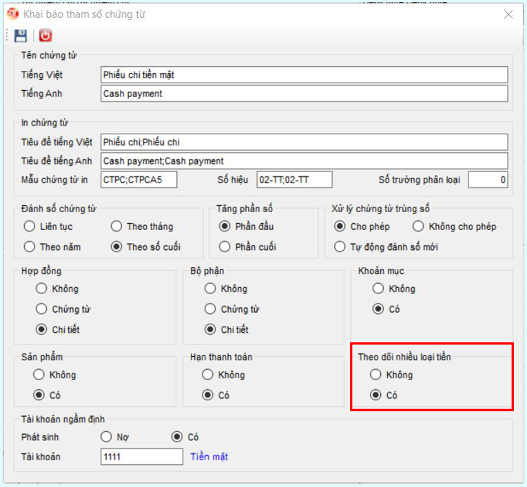 Bước 2: Khai báo theo dõi nhiều loại tiền trong chứng từ.