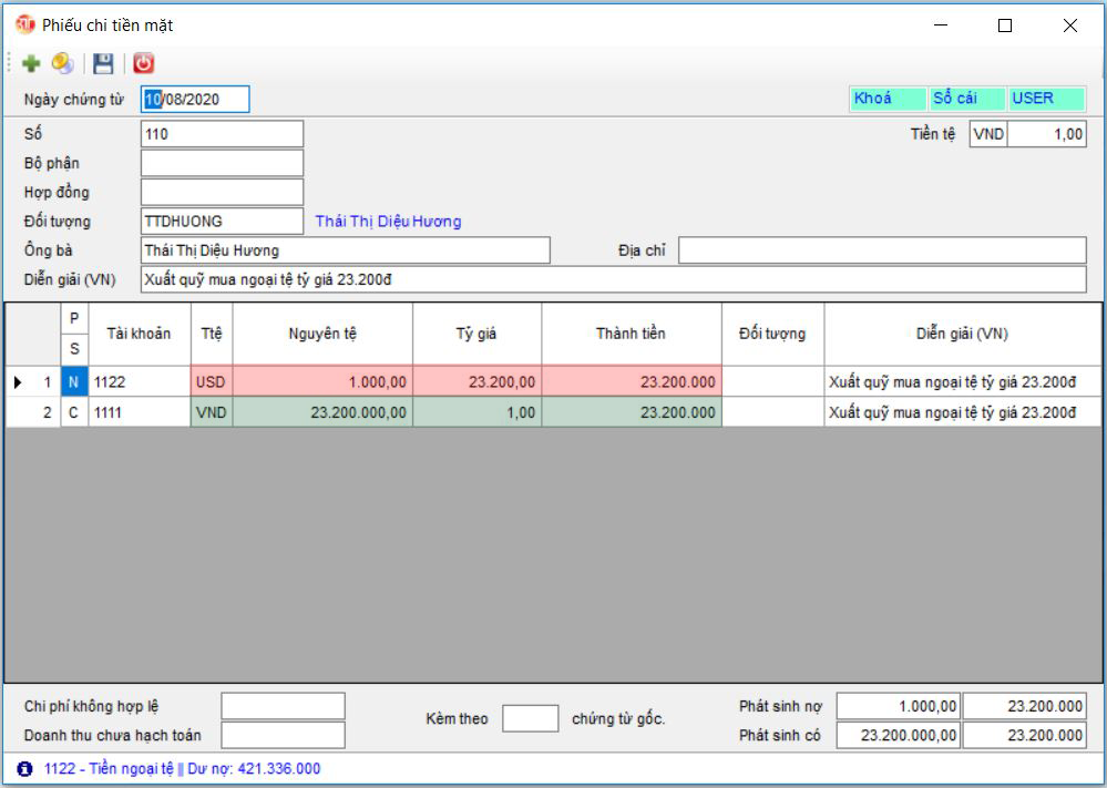 Ví dụ: Xuất quỹ tiền mặt mua ngoại tệ của ngân hàng. Mua 1.000 USD với tỷ giá mua: 23.200đ.