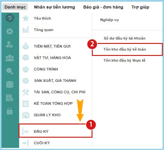 Bước 2: Vào mục “Đầu kỳ” sau đó tìm tới mục “Tồn kho đầu kỳ kế toán”