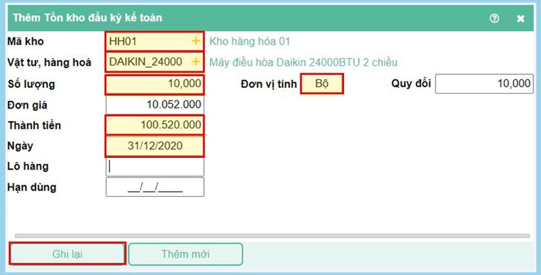 Bước 3: Khai báo chi tiết dữ liệu tồn kho đầu kỳ của từng vật tư, hàng hóa