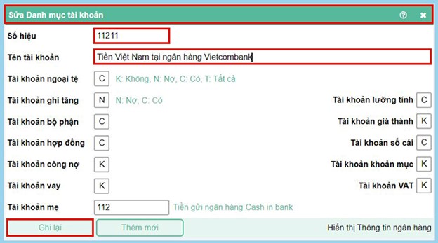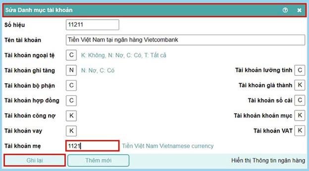 Bước 4: Sửa tiểu khoản con: Khai báo thêm tham số “Tài khoản mẹ” cho tiểu khoản đó