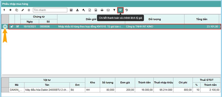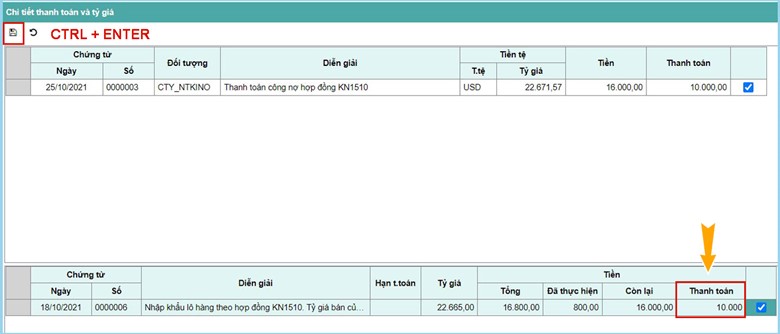 Ví dụ tống ngoại tệ chuyển khoản thanh toán trong ảnh minh họa là 16.000 USD nhưng xác nhận thanh toán 10.000 USD cho đơn hàng nhập kho ngày 18/10/2021 còn 10.000 USD là đặt cọc cho hợp đồng mới thì tương ứng cột Thanh toán tự gõ: 10.000 USD.
