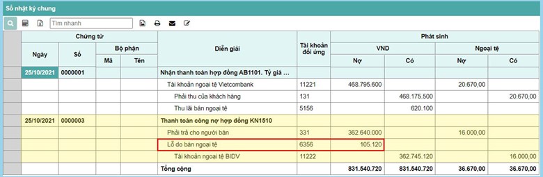 Sau khi hoàn thiện hạch toán và Tích chọn thanh toán theo hóa đơn kiểm tra lại các tài khoản hạch toán liên quan để chắc chắn chênh lệch tỷ giá được ghi nhận.