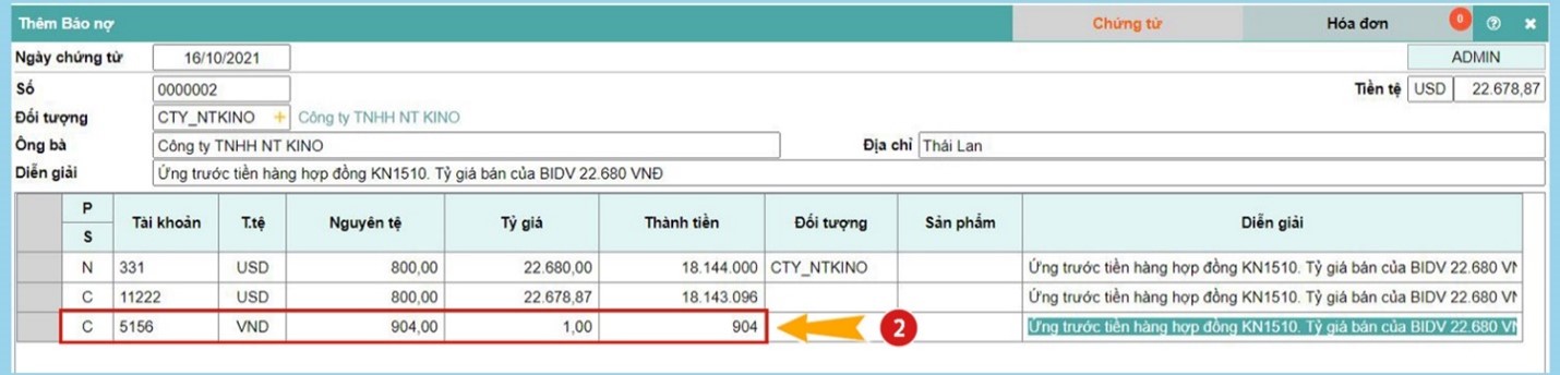 Ngày 16/10/2021, Chuyển khoản 800 USD từ tài khoản ngoại tệ Ngân hàng BIDV cho Công ty TNHH NT KINO ứng trước cho hợp đồng KN1510. Tỷ giá bán ngoại tệ của BIDV tại ngày 16/10/2021 là 22.680 VNĐ
