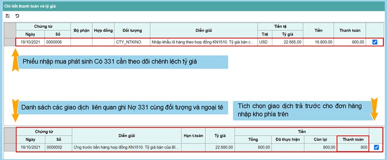 Phần mềm sẽ hiện ra danh sách các giao dịch ghi Nợ 331 liên quan đến ngoại tệ và đối tượng tương ứng với hóa đơn bán hàng. Tại đây khách hàng tích chọn giao dịch đã trả trước cho lần nhập kho này.