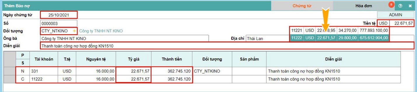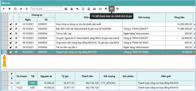 Tiền tệ: Mã ngoại tệ giao dịch công nợ. Nguyên tệ: Giá trị ngoại tệ thanh toán. Tỷ giá: Nhảy theo tỷ giá của chứng từ (tỷ giá xuất quỹ) Thành tiền: Giá trị quy đổi ra đồng tiền hạch toán (VNĐ) theo tỷ giá xuất quỹ. |