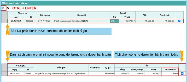 Tích chọn chức năng “Chi tiết thanh toán và chênh lệch tỷ giá”