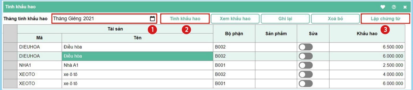 | 2 | Xem khấu hao | Xem lại giá trị khấu hao đã lưu của tháng đó. |