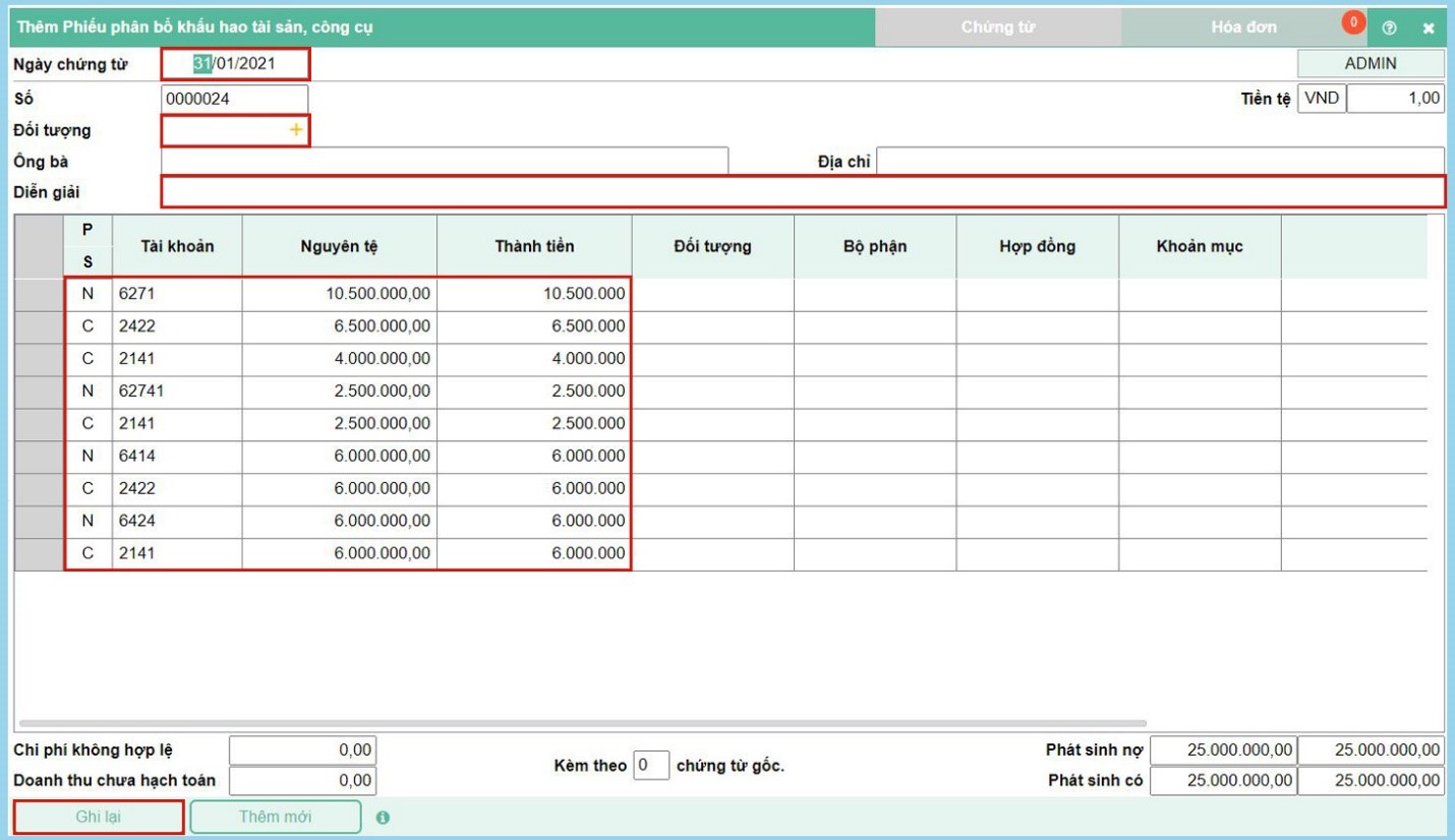 Nhấn “Ghi lại” hoặc phím tắt CTRL + ENTER để lưu chứng từ. Hoàn tất thao tác tính khấu hao.