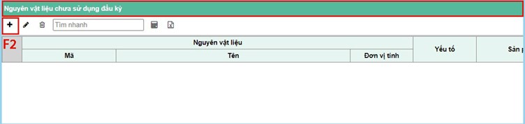 Nhấn dấu + trên thanh menu hoặc phím tắt F2 để lần lượt khai báo thông tin về vật tư, nguyên vật liệu chưa sử dụng kết từ kỳ trước.