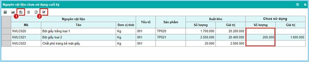 Người dùng sẽ nhấn vào biểu tượng dấu tích (2) để phần mềm thực hiện xác định giá trị vật tư chưa sử dụng căn cứ vào dữ liệu vật tư, nguyên vật liệu nhập xuất cuối cùng. Tiếp đó nhấn biểu tượng lưu (1) để lưu dữ liệu vật tư chưa sử dụng cuối kỳ.