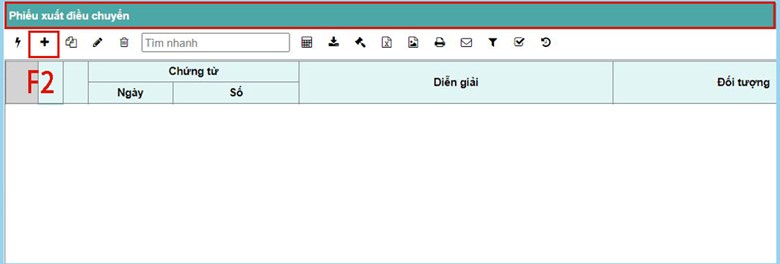 Tại màn hình nghiệp vụ Phiếu xuất điều chuyển nhấn dấu + trên thanh menu hoặc phím tắt F2 để thêm mới chứng từ nhập liệu.